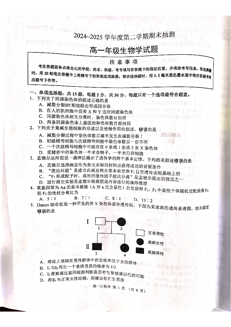 江苏省徐州市2024-2025学年高一年级下学期期末考试生物