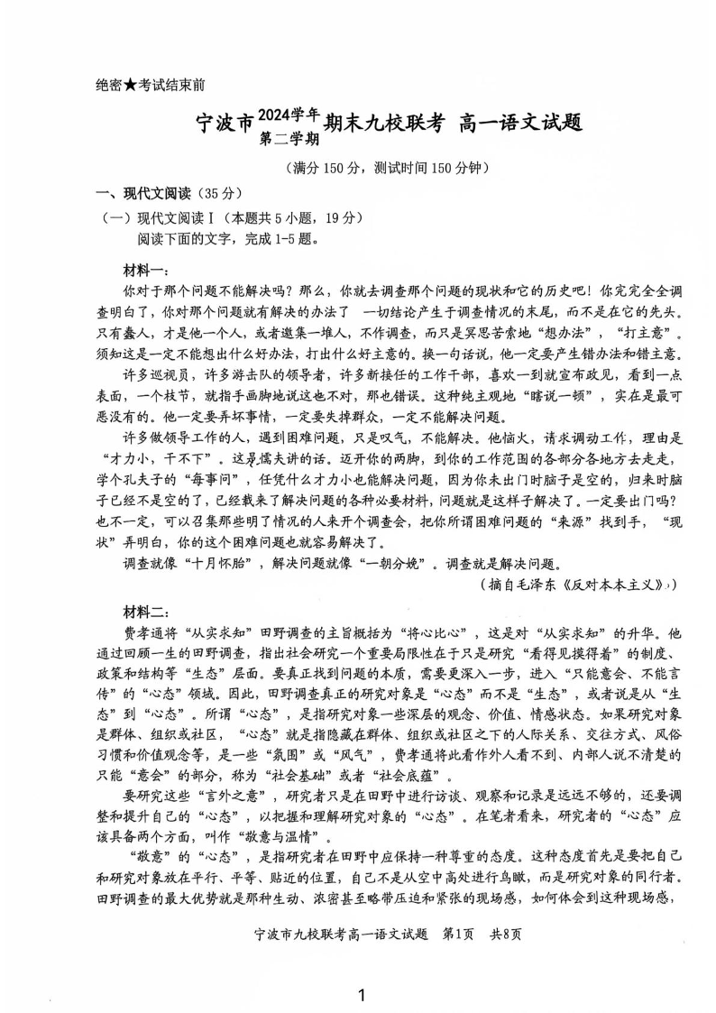 浙江宁波市2024-2025高一下期末九校联考语文+答案
