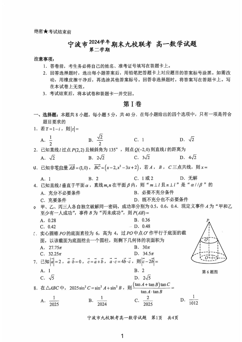浙江宁波市2024-2025高一下期末九校联考数学+答案