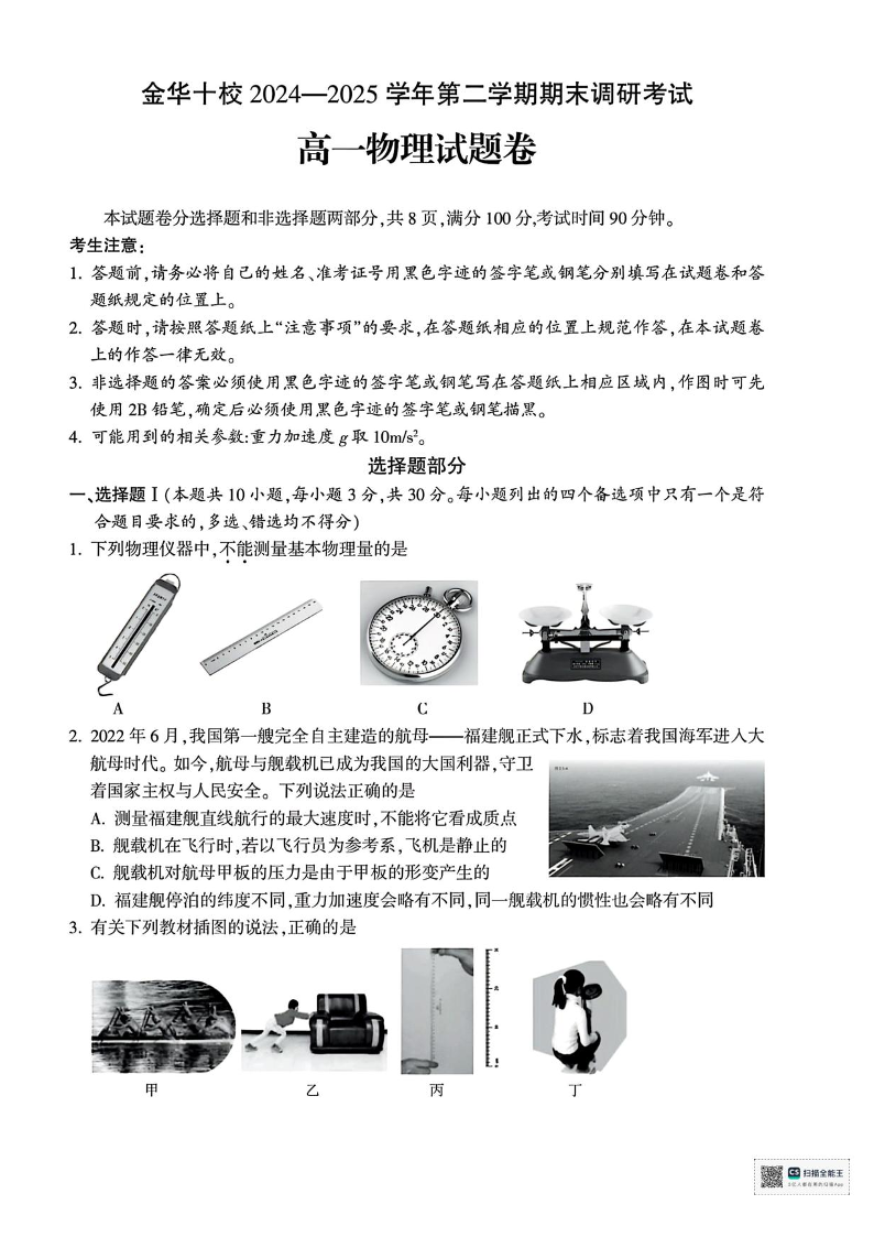浙江省金华市十校2024-2025学年高一下学期6月期末考试物理+答案