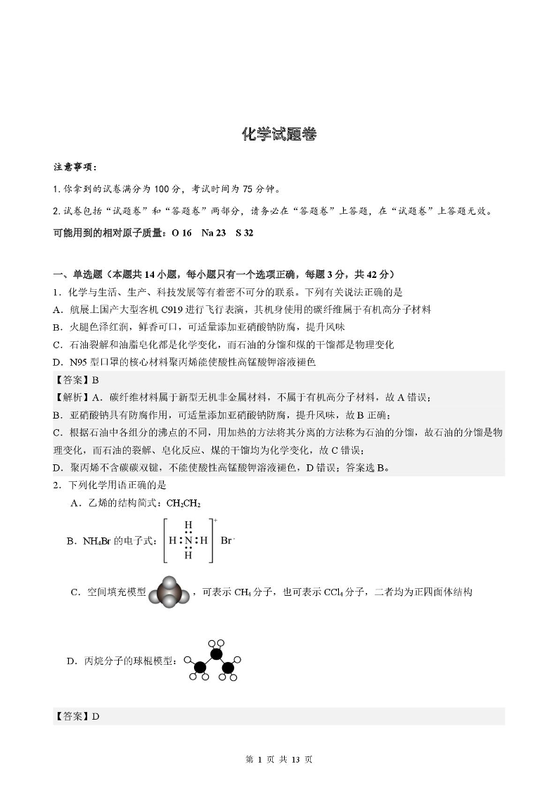 高一化学答案--安徽省智学联考2024-2025学年高一下学期7月期末考试