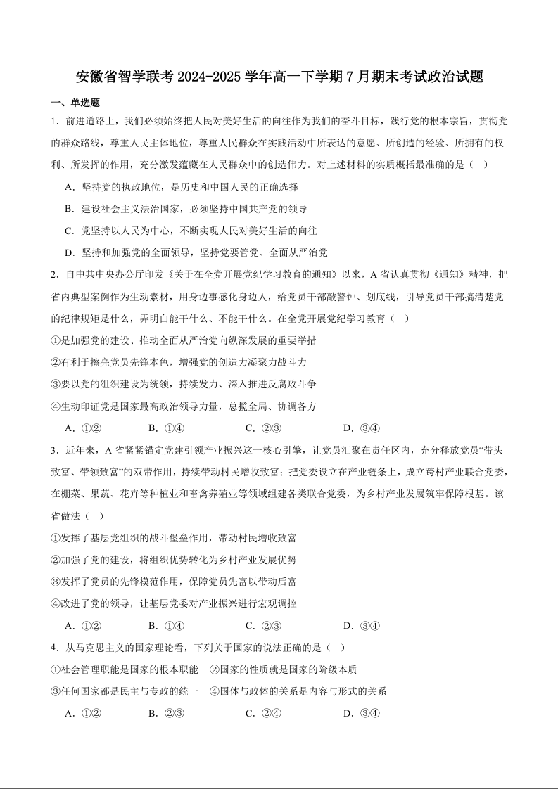 高一政治+答案--安徽省智学联考2024-2025学年高一下学期7月期末考试