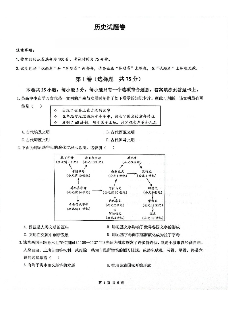 高一历史+答案--安徽省智学联考2024-2025学年高一下学期7月期末考试