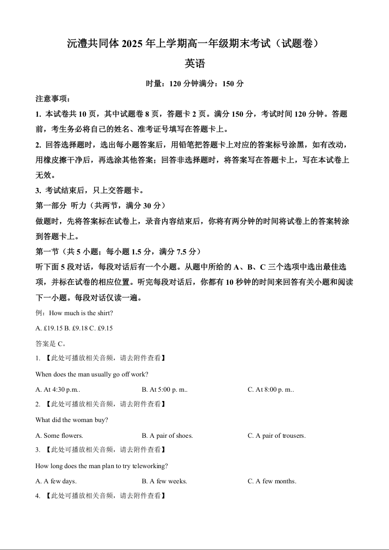 高一英语+答案--湖南省沅澧共同体2024-2025学年高一下学期期末考试