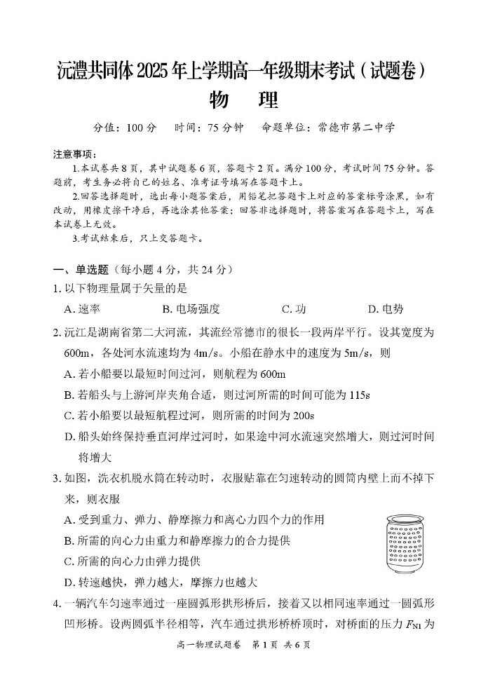 高一物理--湖南省沅澧共同体2024-2025学年高一下学期期末考试