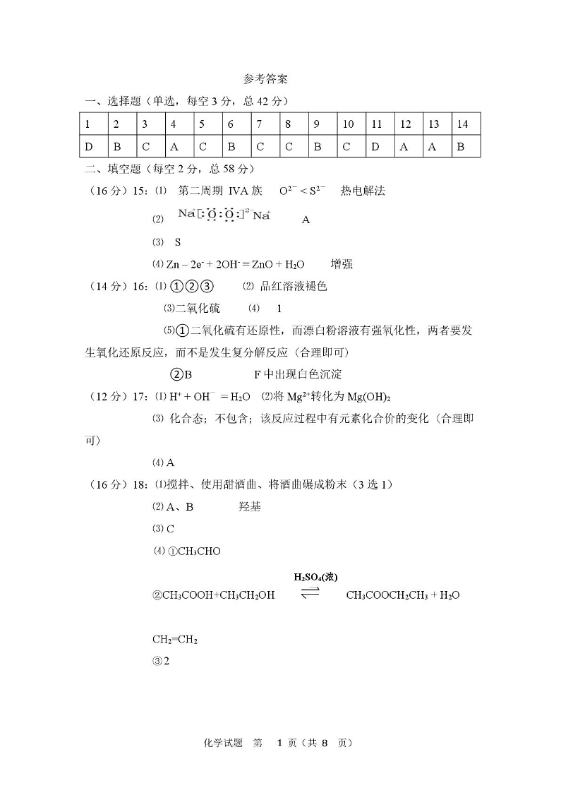 高一化学答案--湖南省沅澧共同体2024-2025学年高一下学期期末考试