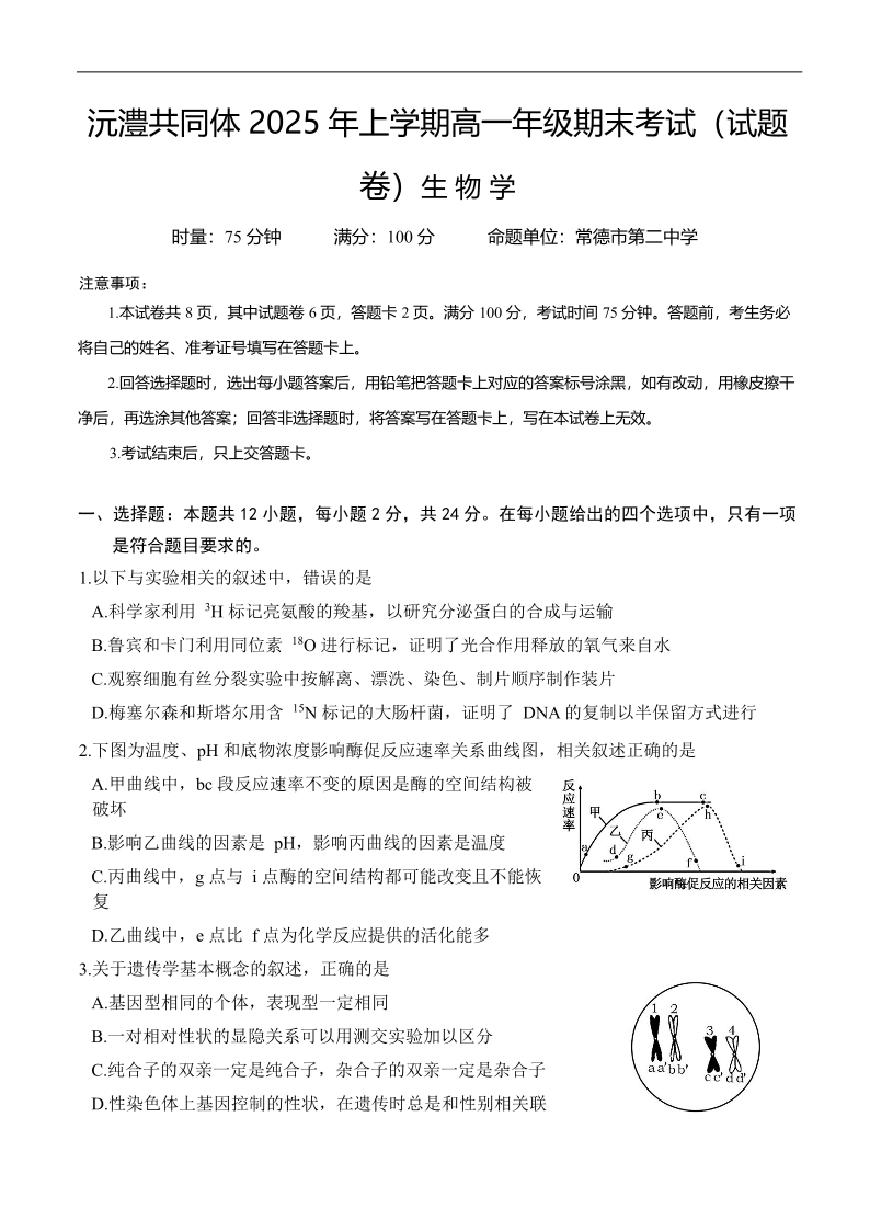 高一生物--湖南省沅澧共同体2024-2025学年高一下学期期末考试