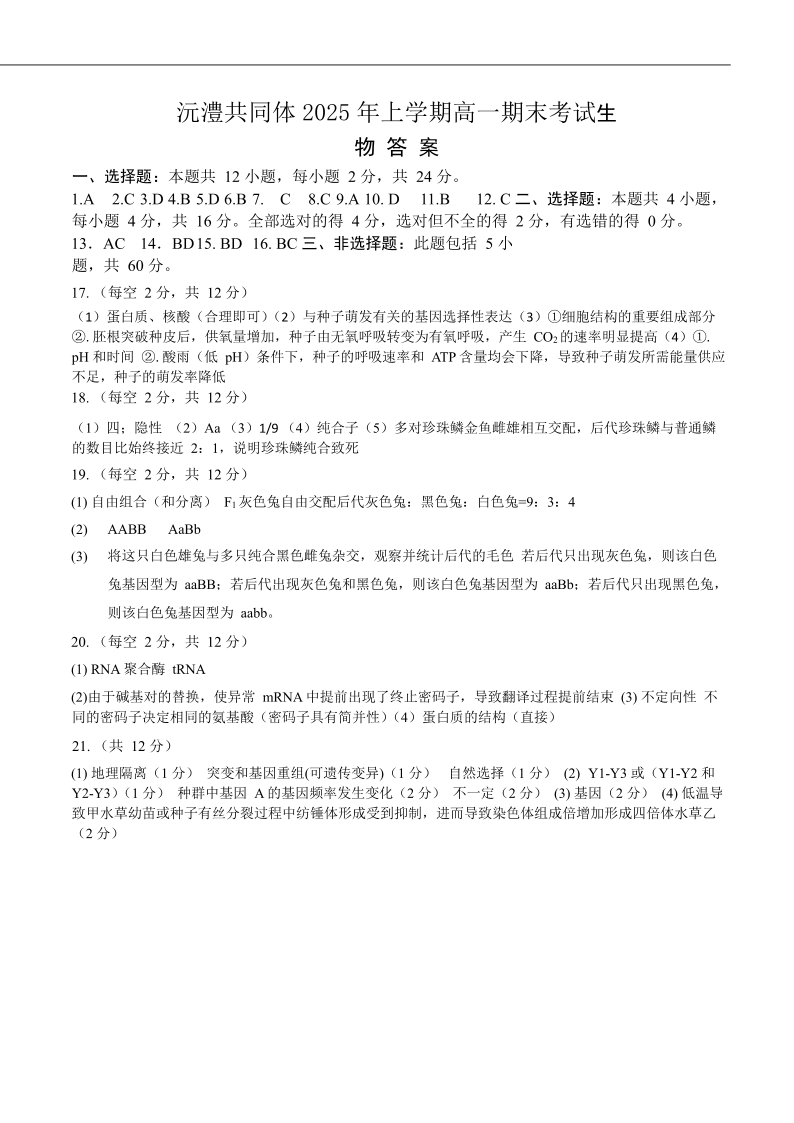 高一生物答案--湖南省沅澧共同体2024-2025学年高一下学期期末考试