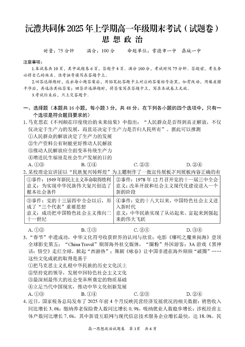 高一政治--湖南省沅澧共同体2024-2025学年高一下学期期末考试