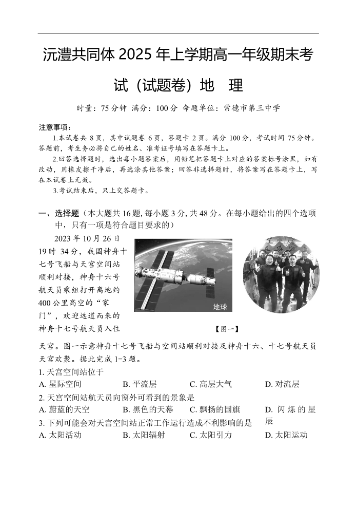 高一地理--湖南省沅澧共同体2024-2025学年高一下学期期末考试