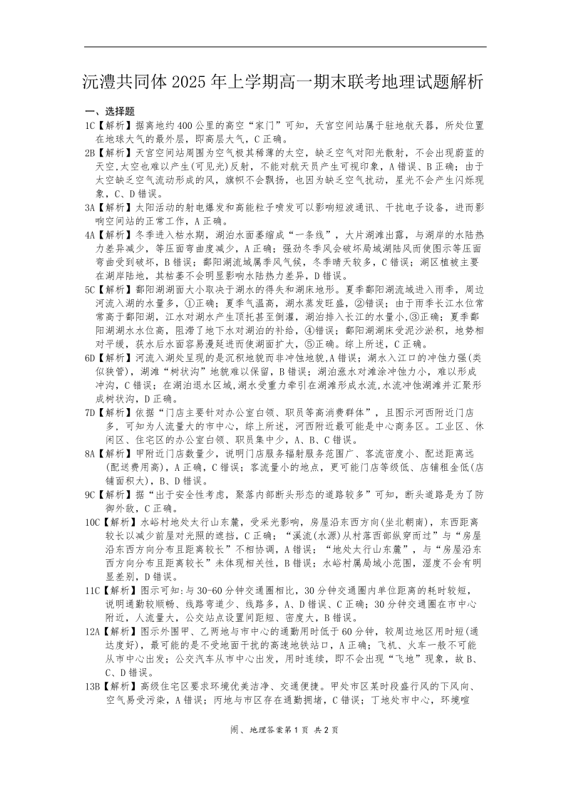 高一地理答案--湖南省沅澧共同体2024-2025学年高一下学期期末考试