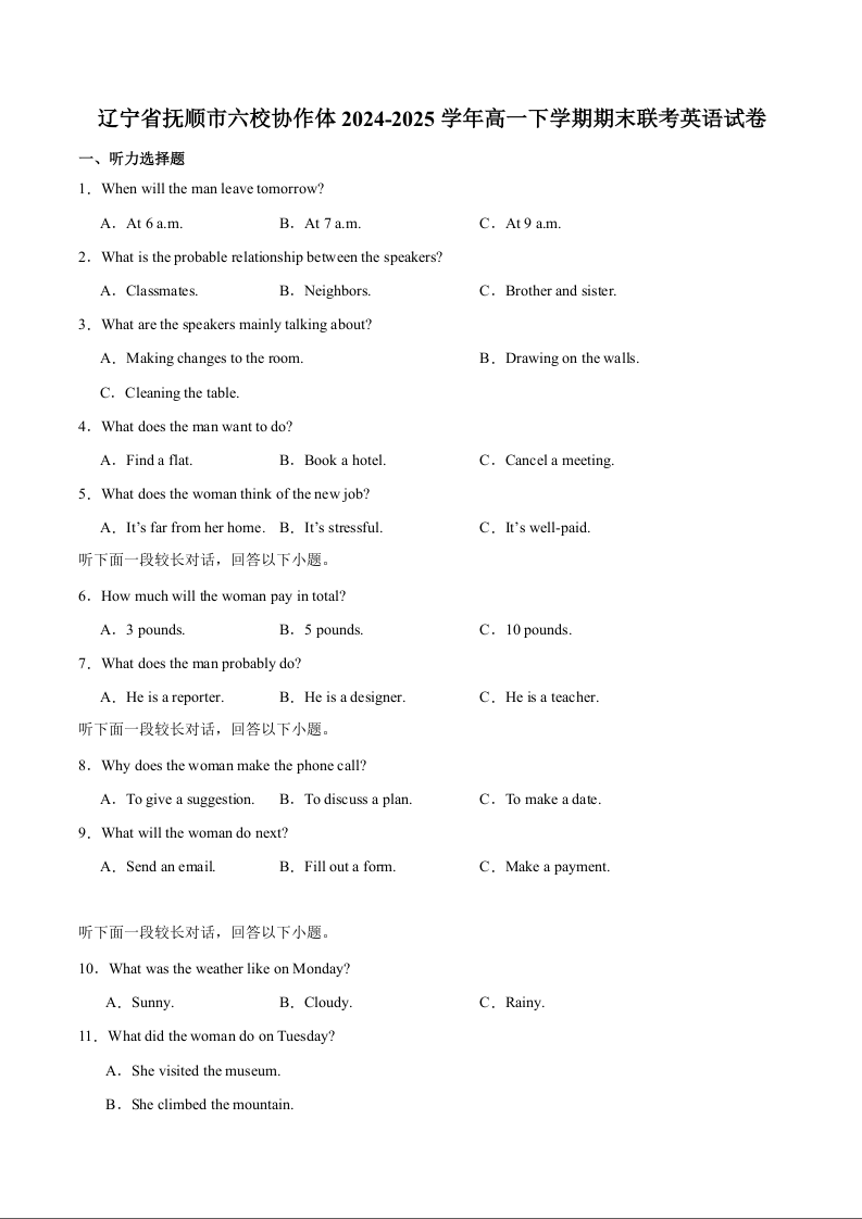 高一英语+答案--辽宁省抚顺市六校协作体2024-2025学年高一下学期7月期末考试