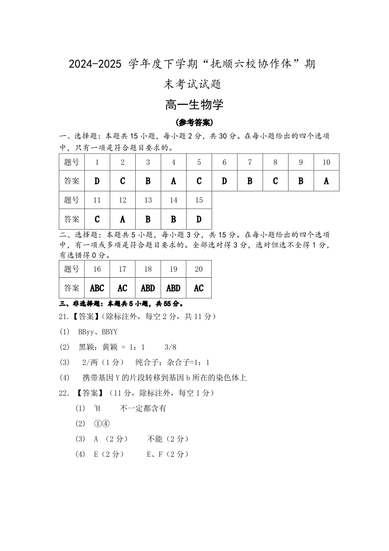 高一生物答案--辽宁省抚顺市六校协作体2024-2025学年高一下学期7月期末考试