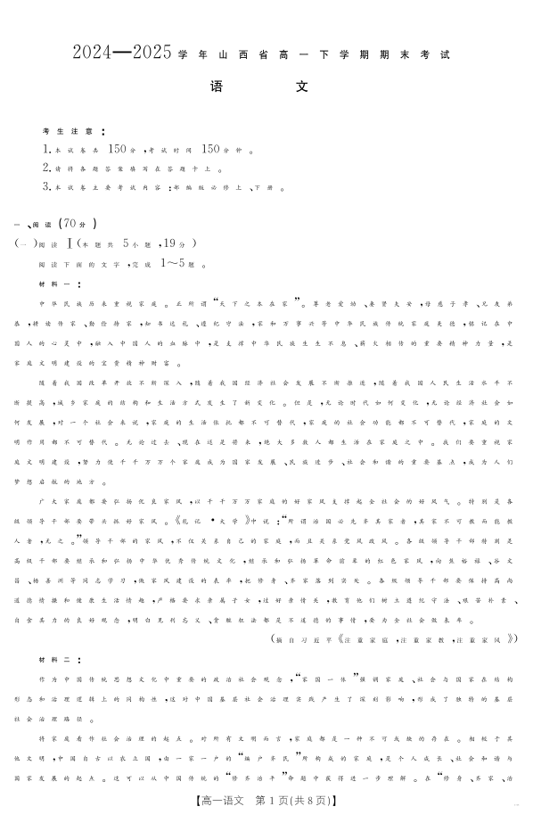 高一语文--山西省2024-2025学年高一下学期期末考试