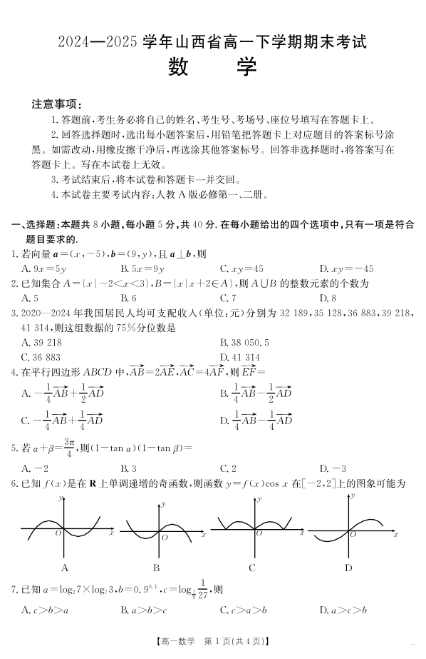 高一数学--山西省2024-2025学年高一下学期期末考试