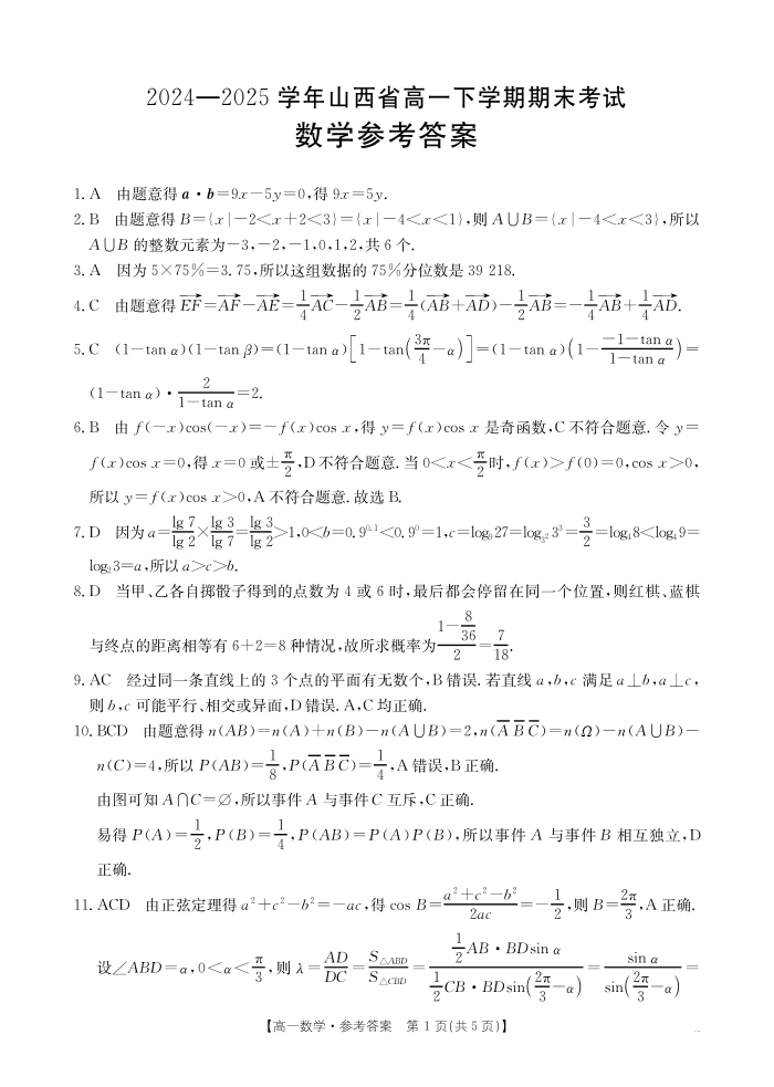高一数学答案--山西省2024-2025学年高一下学期期末考试