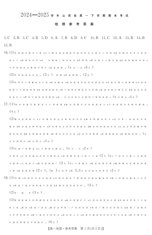 高一地理答案--山西省2024-2025学年高一下学期期末考试