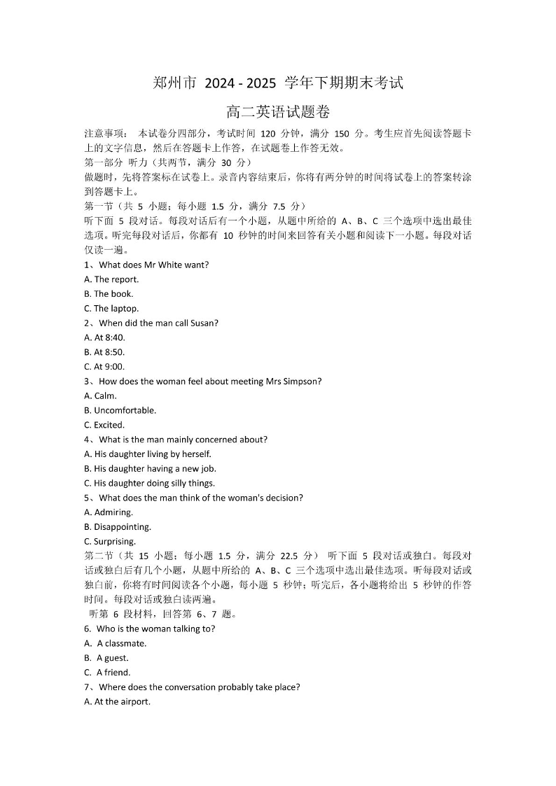 河南省郑州市2024-2025学年高二下学期期末考试英语+答案