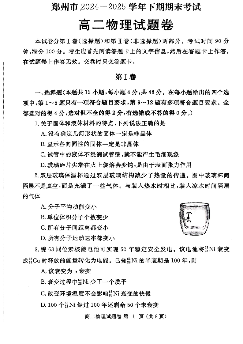 河南省郑州市2024-2025学年高二下学期期末考试物理