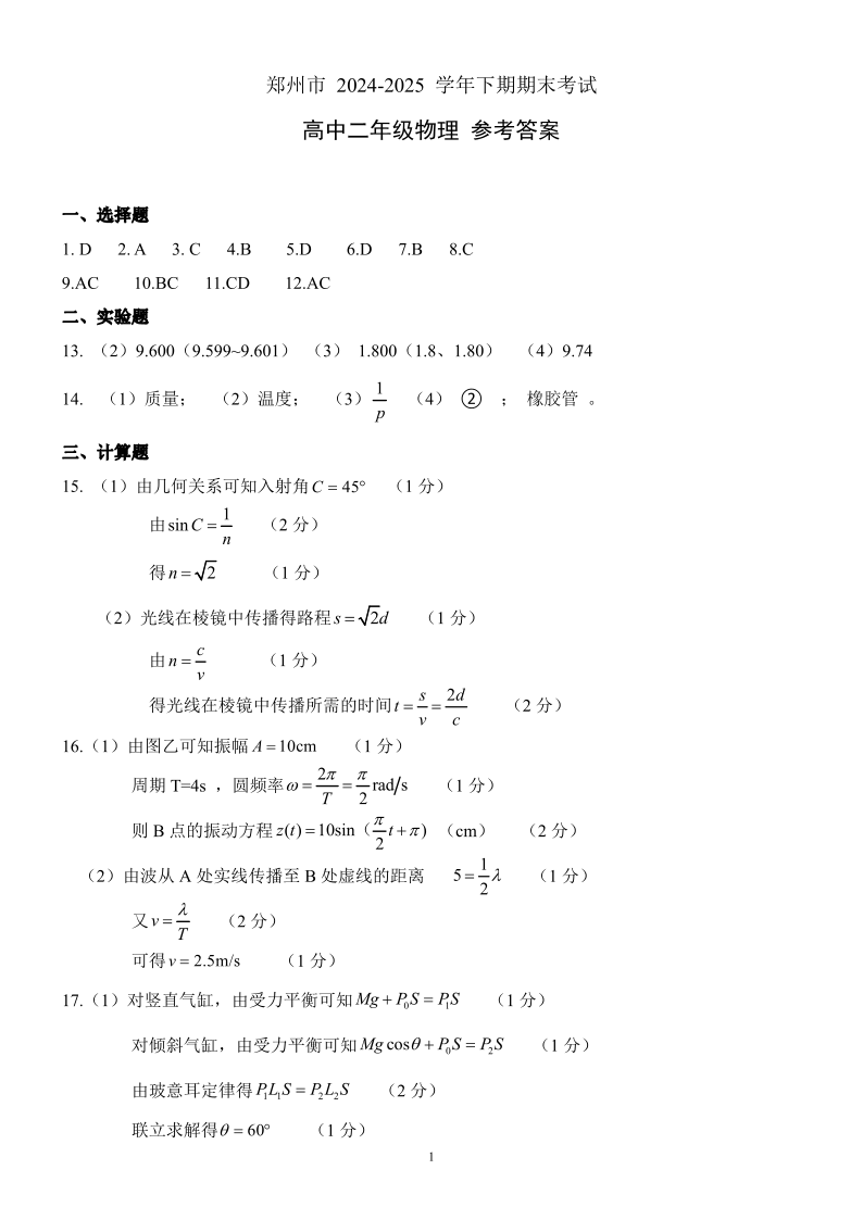 河南省郑州市2024-2025学年高二下学期期末考试物理答案