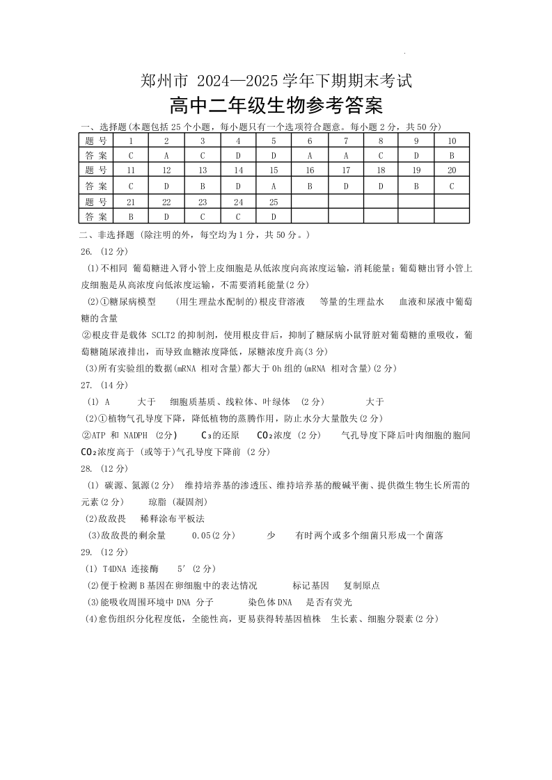 河南省郑州市2024-2025学年高二下学期期末考试生物答案