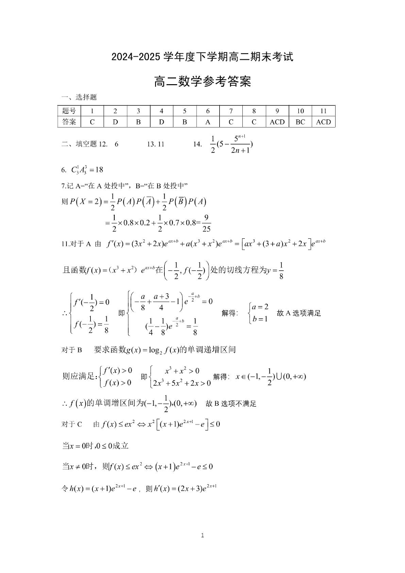 湖北省七市州2024-2025学年度高二下学期期末联考数学答案