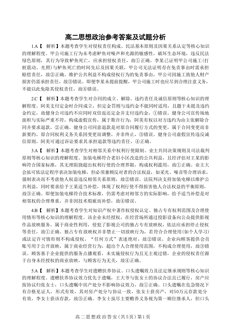 湖北省七市州2024-2025学年度高二下学期期末联考政治答案