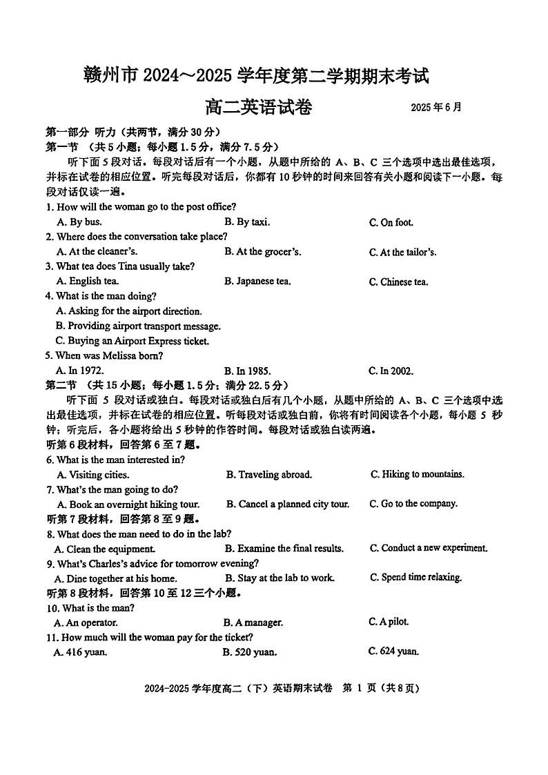 江西省赣州市2024-2025学年度第二学期高二年级期末考试英语