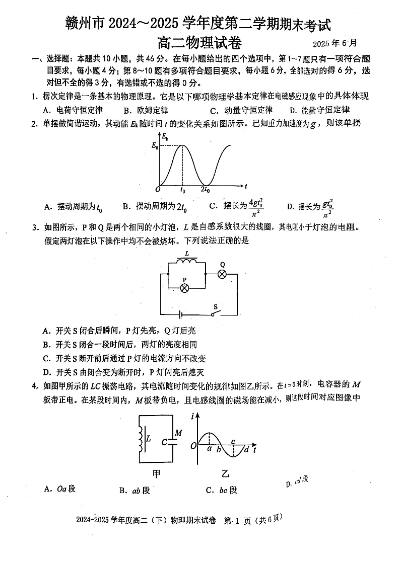 江西省赣州市2024-2025学年度第二学期高二年级期末考试物理