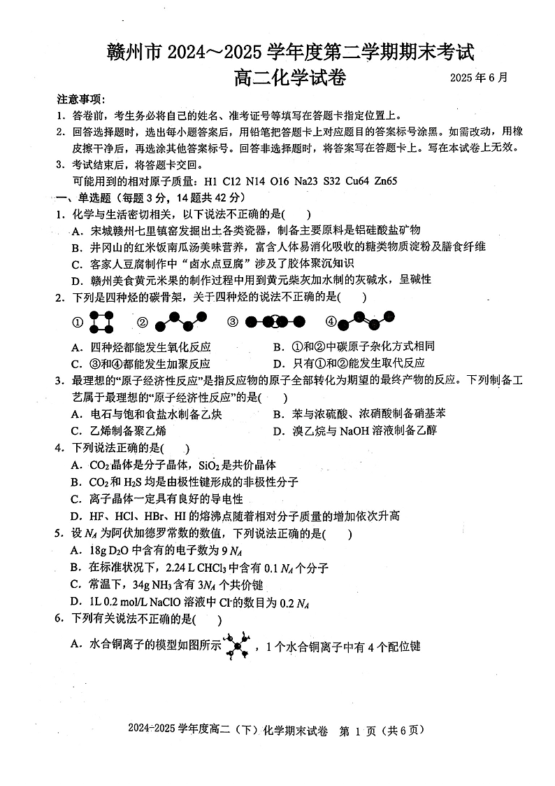 江西省赣州市2024-2025学年度第二学期高二年级期末考试化学