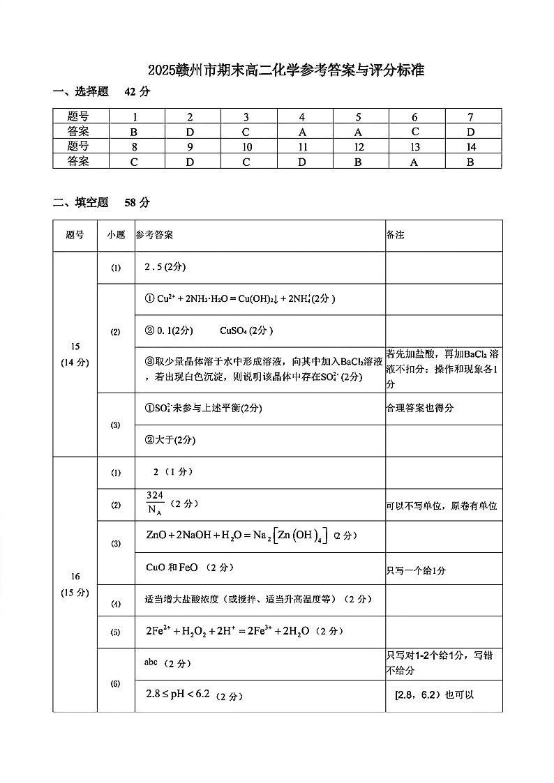 江西省赣州市2024-2025学年度第二学期高二年级期末考试化学答案