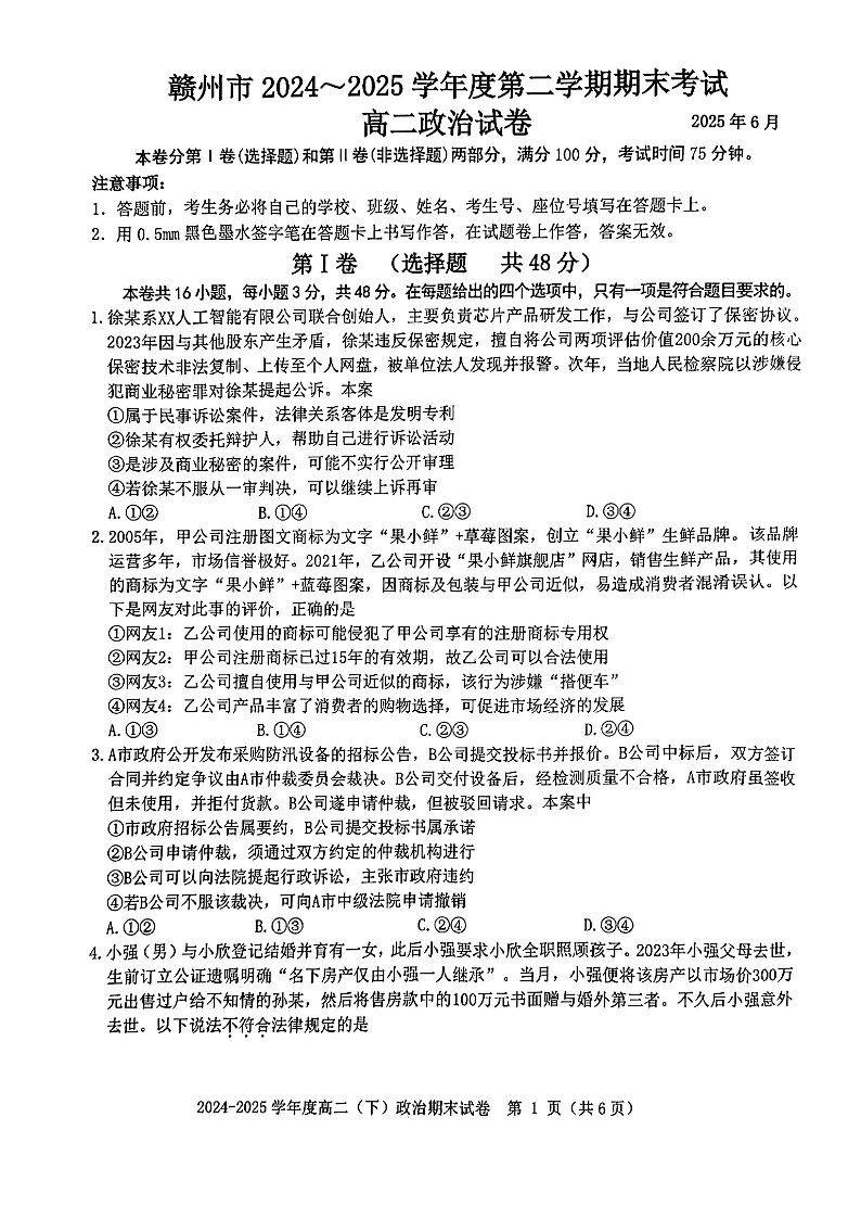 江西省赣州市2024-2025学年度第二学期高二年级期末考试政治