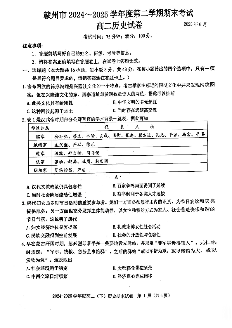 江西省赣州市2024-2025学年度第二学期高二年级期末考试历史