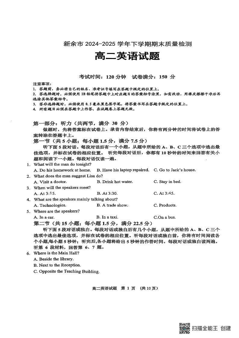 江西省新余市2024-2025学年高二下学期期末质量检测英语+答案