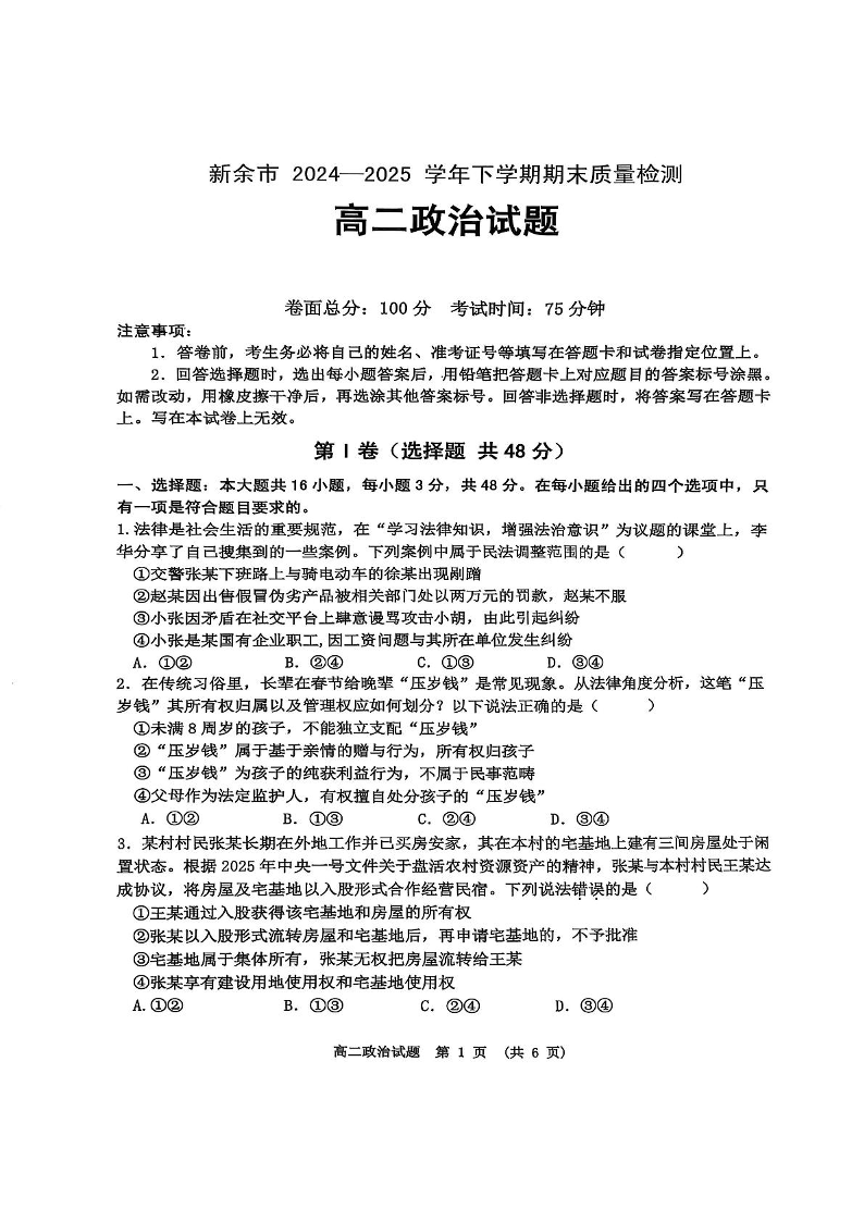 江西省新余市2024-2025学年高二下学期期末质量检测政治