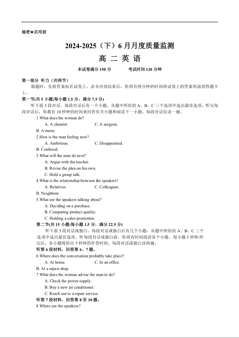 辽宁省沈文新高考研究联盟2024-2025学年高二下学期6月月考英语+答案