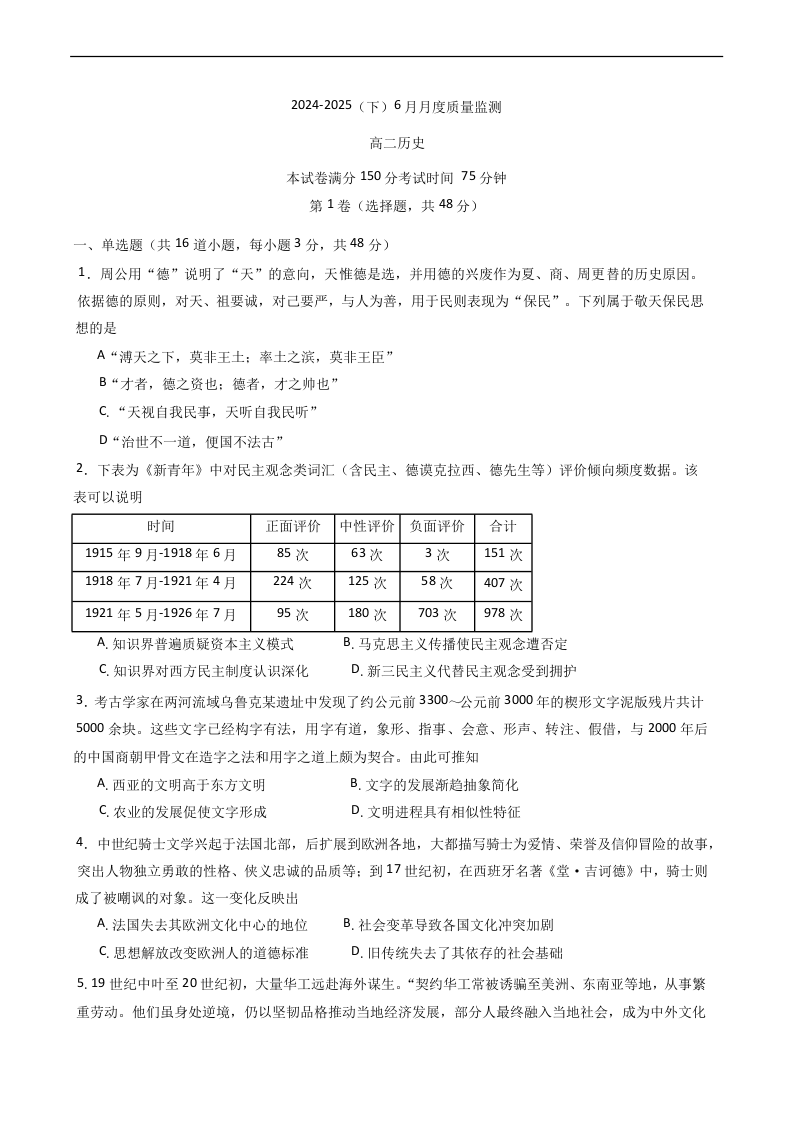 辽宁省沈文新高考研究联盟2024-2025学年高二下学期6月月考历史+答案