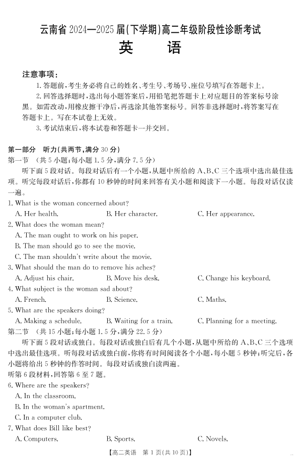 云南省曲靖市2024-2025届高二下学期阶段性诊断考试 英语