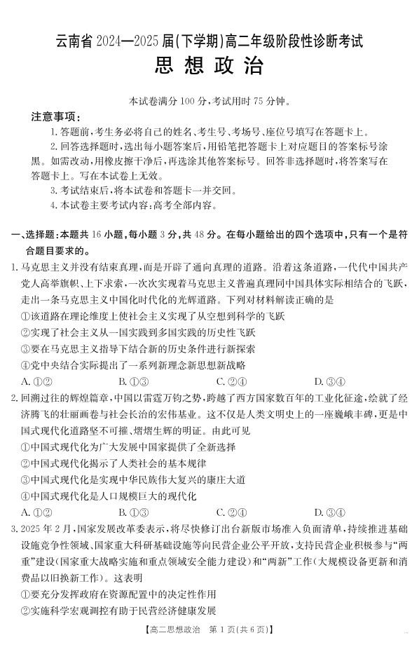 云南省曲靖市2024-2025届高二下学期阶段性诊断考试 思想政治