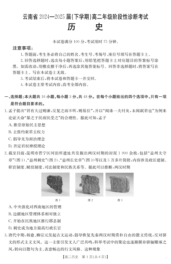 云南省曲靖市2024-2025届高二下学期阶段性诊断考试 历史