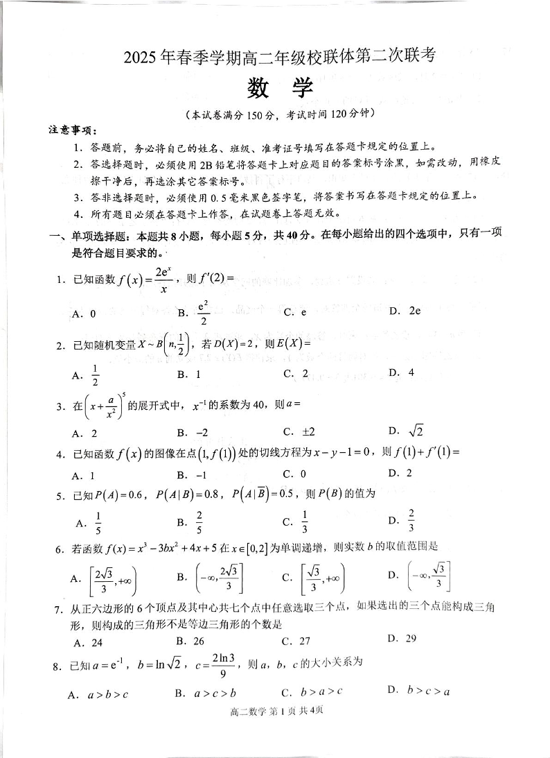 广西河池市十校协作体2024-2025学年高二下学期5月第二次联考试题数学+答案