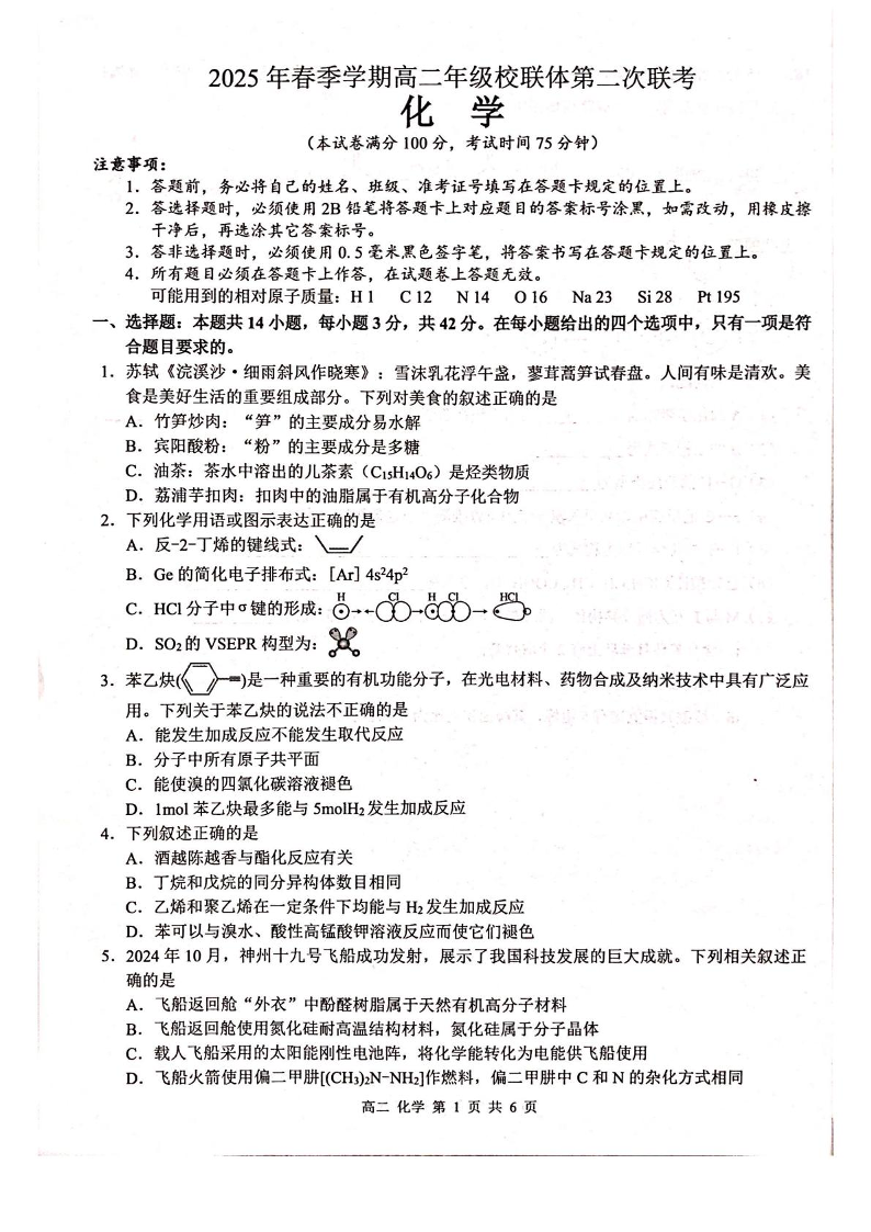 广西河池市十校协作体2024-2025学年高二下学期5月第二次联考试题化学+答案