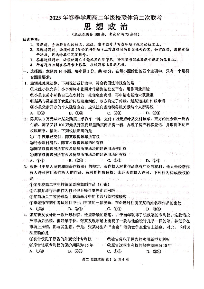 广西河池市十校协作体2024-2025学年高二下学期5月第二次联考试题政治+答案