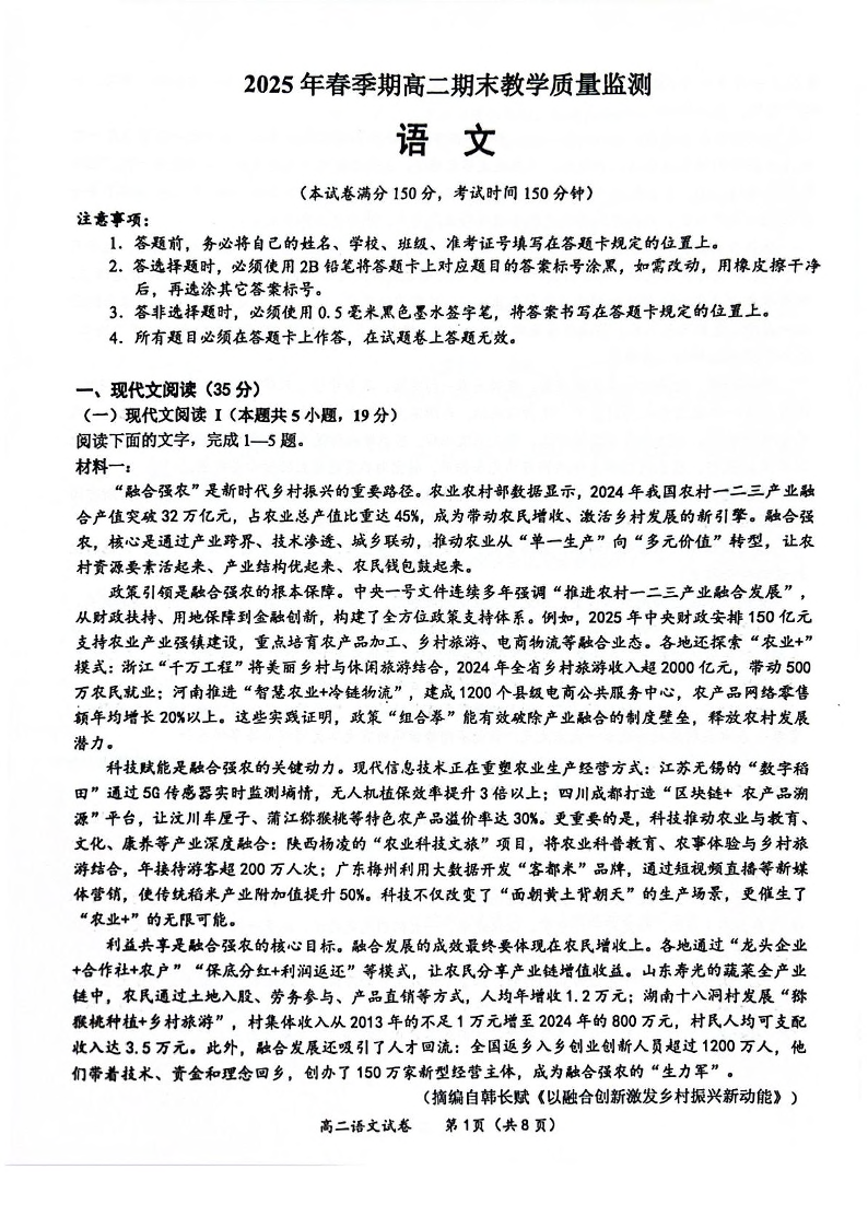广西南宁市部分学校2024-2025学年高二下学期6月期末考试 语文+答案