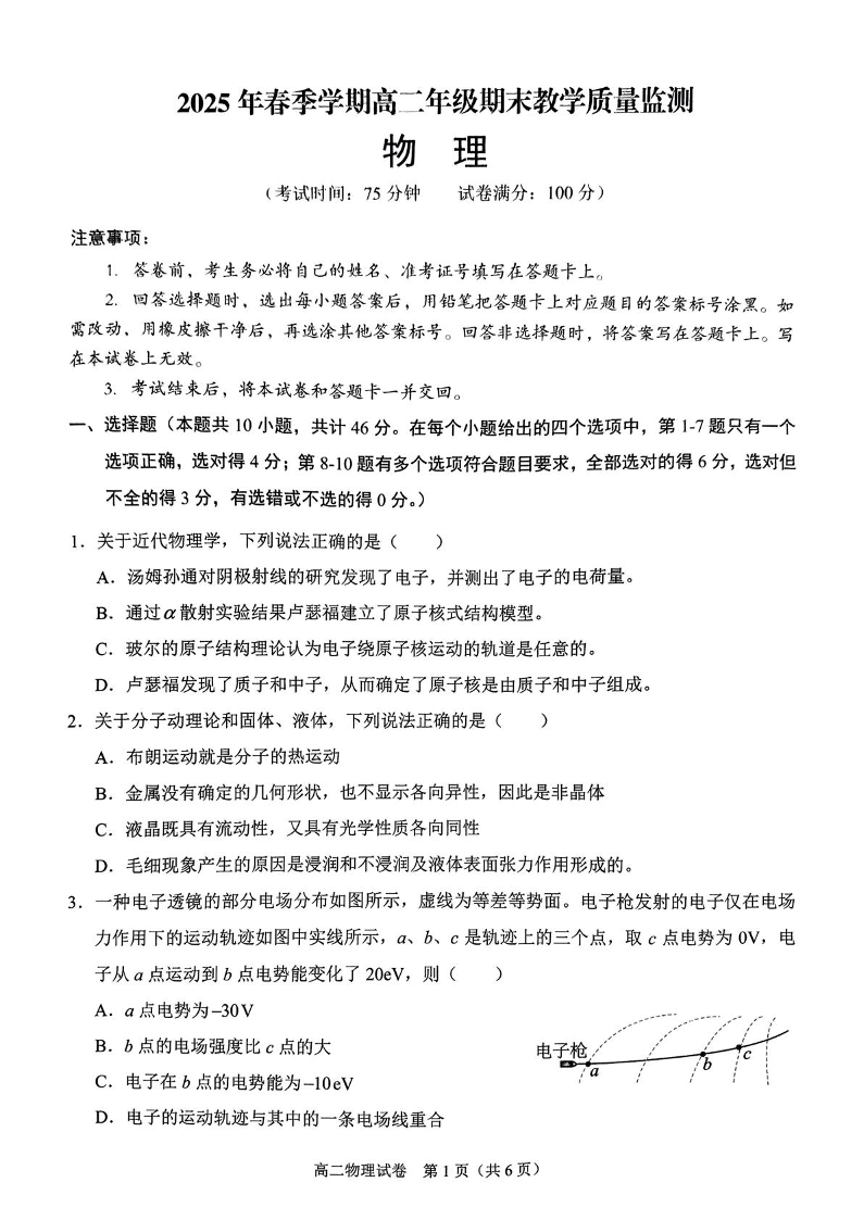 广西南宁市部分学校2024-2025学年高二下学期6月期末考试 物理+答案