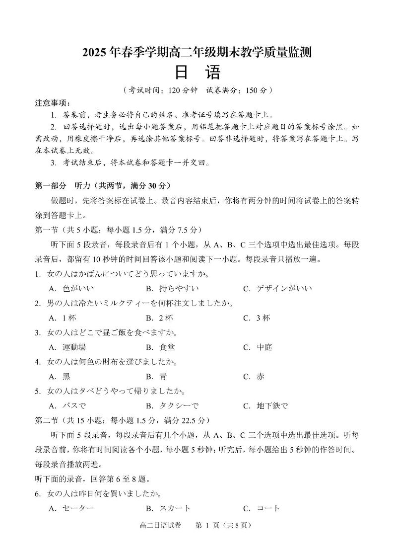 广西南宁市部分学校2024-2025学年高二下学期6月期末考试 日语