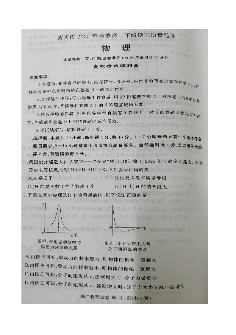 湖北省黄冈市2024-2025学年高二下学期期末质量监测物理