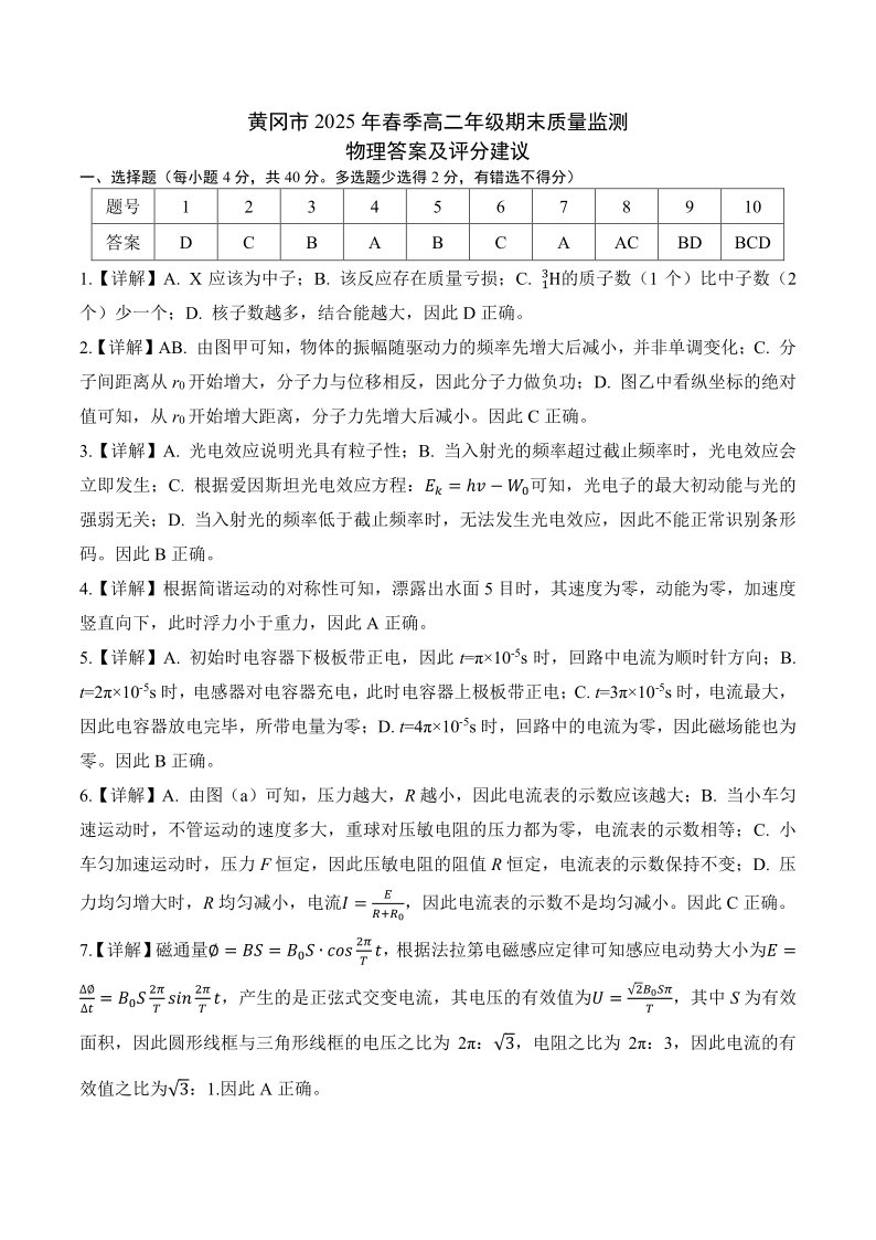 湖北省黄冈市2024-2025学年高二下学期期末质量监测物理答案