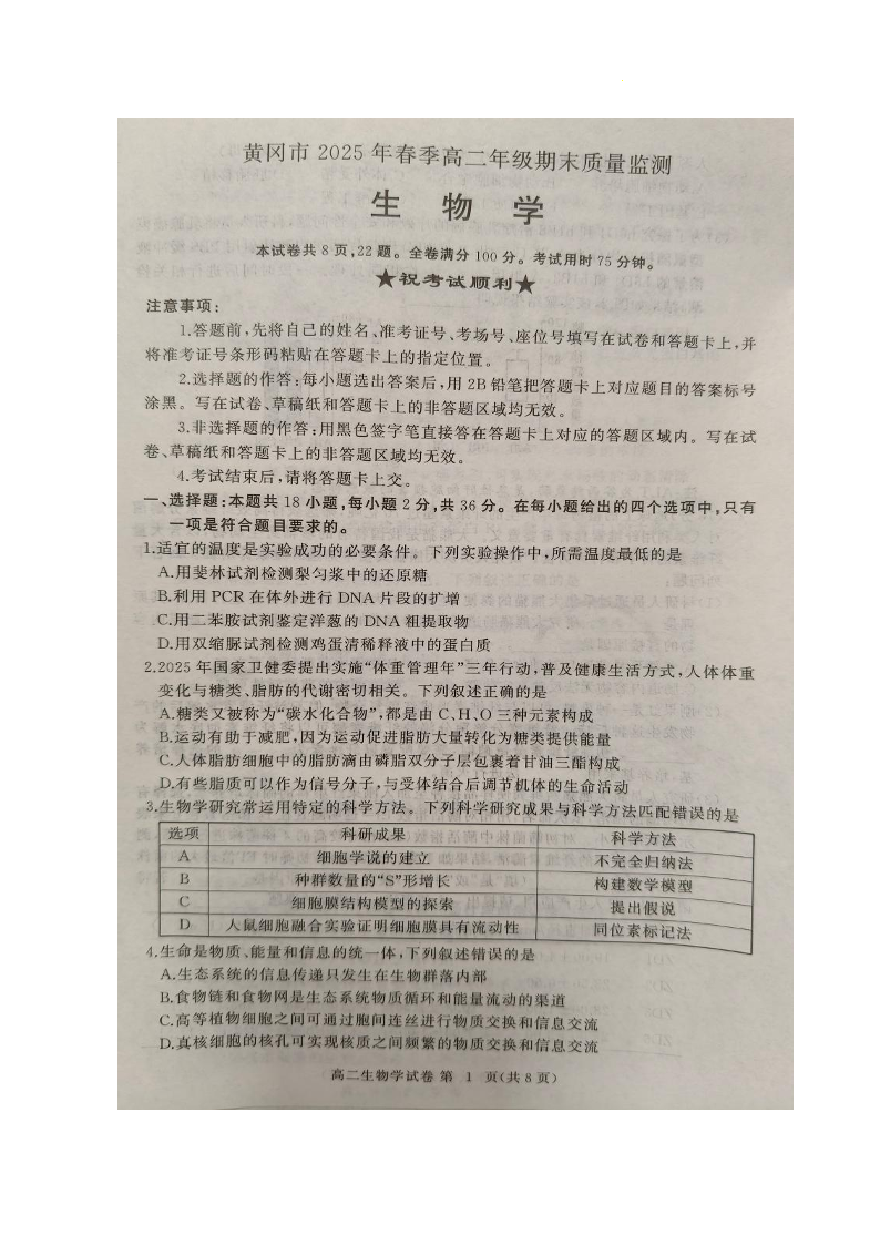 湖北省黄冈市2024-2025学年高二下学期期末质量监测生物+答案
