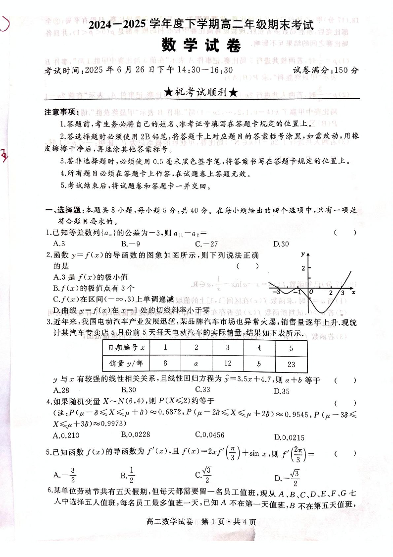 湖北省武汉市五校联合体2024-2025学年高二下学期6月期末数学